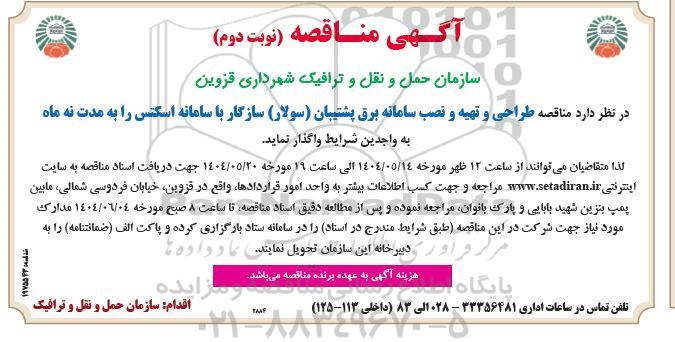 سازمان حمل و نقل و ترافیک شهرداری قزوین در نظر دارد مناقصه طراحی و تهیه و نصب سامانه برق پشتیبان (سولار) سازگار با سامانه اسکتس را به مدت نه ماه به واجدین شرایط واگذار نماید ، لذا متقاضیان می توانند از ساعت 12 ظهر مورخه 1404.5.14 الی ساعت 19 مورخه 1404.5.20 جهت دریافت اسناد مناقصه به سایت اینترنتی سایت ستاد ایران مراجعه و جهت کسب اطلاعات بیشتر به واحد امور قراردادها ، واقع در قزوین ، خیابان فردوسی شمالی ، مابین پمپ بنزین شهید بابایی و پارک بانوان ، مراجعه نموده و پس از مطالعه دقیق اسناد مناقصه ، تا ساعت ٨ صبح مورخه 1404.6.4 مدارک مورد نیاز جهت شرکت در این مناقصه طبق شرایط مندرج در اسناد) را در سامانه ستاد بارگزاری کرده و پاکت الف (ضمانتنامه را به دبیرخانه این سازمان تحویل نمایند.