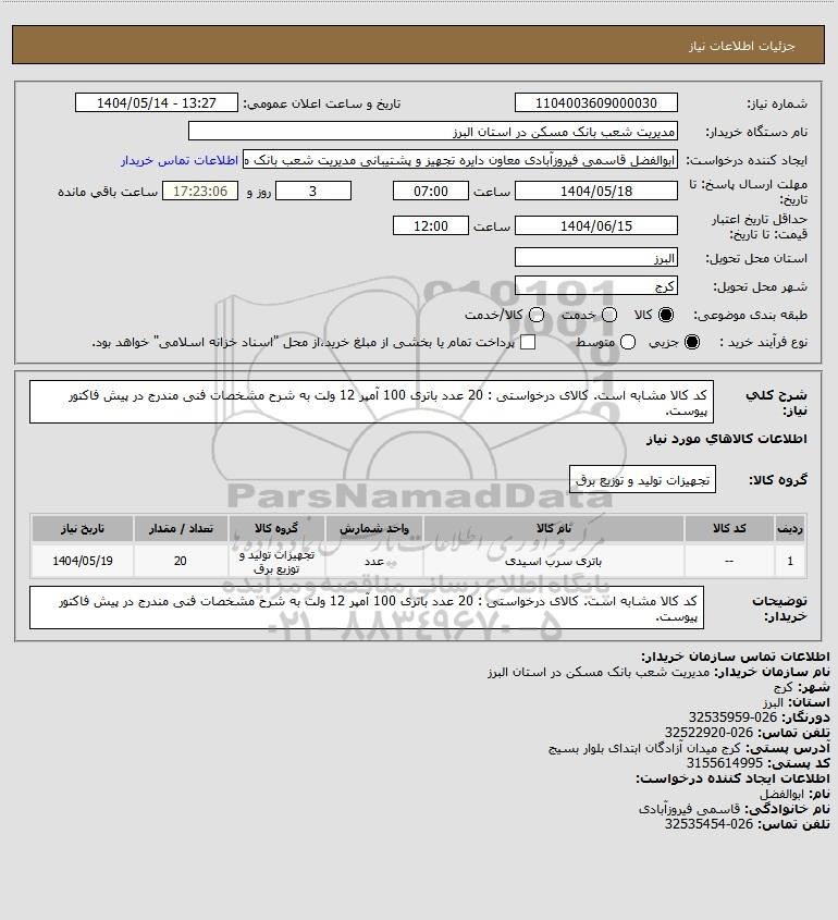 شرح کلی نیاز: کد کالا مشابه است. کالای درخواستی : 20 عدد باتری 100 آمپر 12 ولت به شرح مشخصات فنی مندرج در پیش فاکتور پیوست.