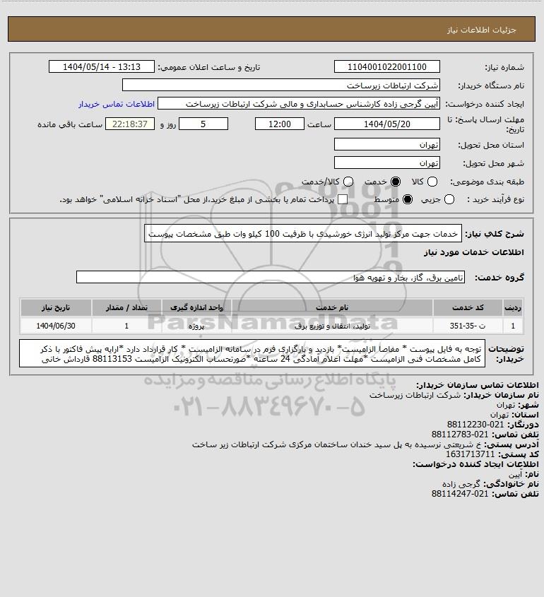 شرح کلی نیاز: خدمات جهت مرکز تولید انرژی خورشیدی با ظرفیت 100 کیلو وات طبق مشخصات پیوست