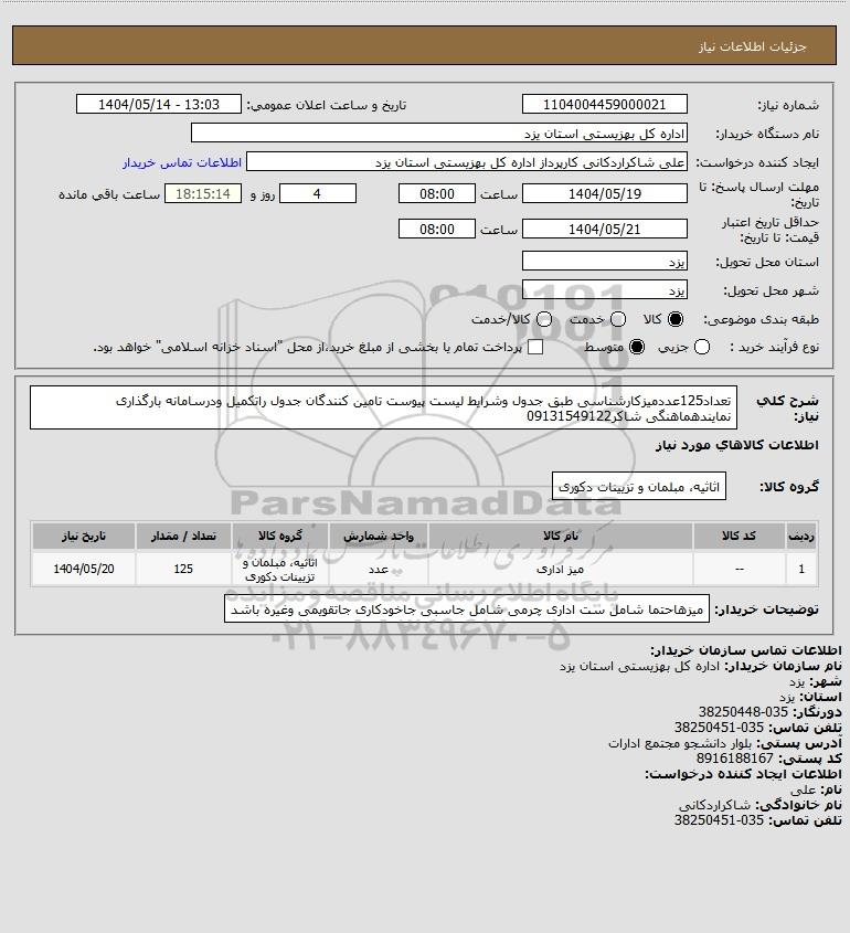 شرح کلی نیاز: تعداد125عددمیزکارشناسی طبق جدول وشرایط لیست پیوست تامین کنندگان جدول راتکمیل ودرسامانه بارگذاری نمایندهماهنگی شاکر09131549122