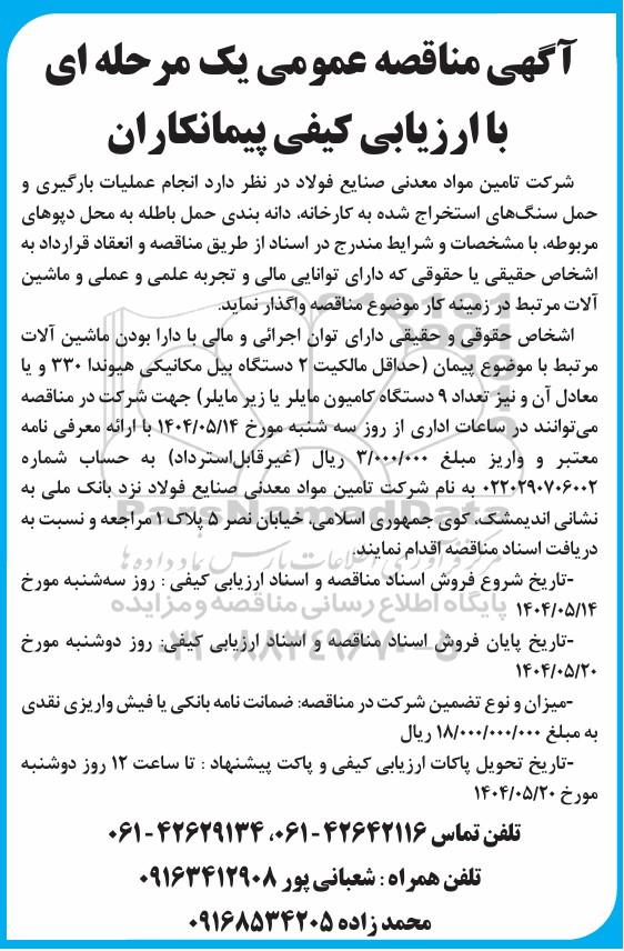 اشخاص حقوقی و حقیقی دارای توان اجرائی و مالی با دارا بودن ماشین آلات مرتبط با موضوع پیمان (حداقل مالکیت 2 دستگاه بیل مکانیکی هیوندا 330 و یا معادل آن و نیز تعداد 9 دستگاه کامیون مایلر یا زیر مایلر) جهت شرکت در مناقصه میتوانند در ساعات اداری از روز سه شنبه مورخ 1404.05.14 با ارائه معرفی نامه معتبر و واریز مبلغ 3.000.000 ریال غیر قابل استرداد به حساب شماره 0220290706002 به نام شرکت تامین مواد معدنی صنایع فولاد نزد بانک ملی به نشانی اندیمشک کوی جمهوری اسلامی خیابان نصر 5 پلاک 1 مراجعه و نسبت به دریافت اسناد مناقصه اقدام نمایند.