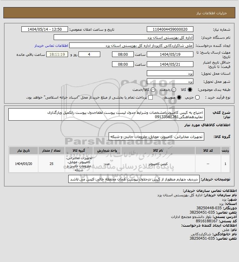 | 1 | -- | کیس کامپیوتر | عدد | تجهیزات مخابراتی، کامپیوتر، موبایل، ملزومات جانبی و شبکه | 25 | 1404/05/20 |