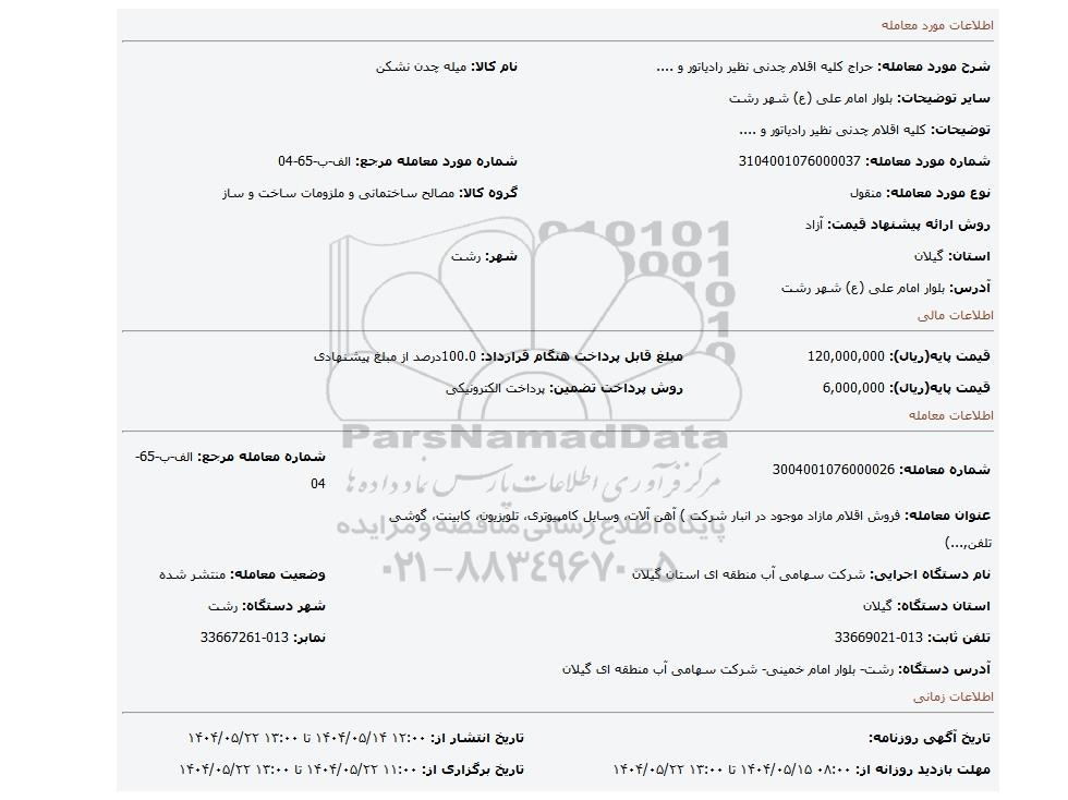 مزایده عمومی مزایده کلیه اقلام چدنی نظیر رادیاتور و برگزار میگردد. از کلیه افراد متخصص و شرکت‌های واجد شرایط دعوت به عمل می‌آید تا در این مزایده با کد خبرگزاری پارس نماد : 9372516 شرکت نمایند تاریخ شروع مزایده : 1404/05/14 مهلت شرکت در مزایده: تا پایان روز 1404/05/22 مکان برگزاری اموال واگذاری استان‌های گیلان و دسته‌بندی‌های مربوط به این حراجی آهن آلات, تاسیسات, مصالح ساختمانی میباشد.