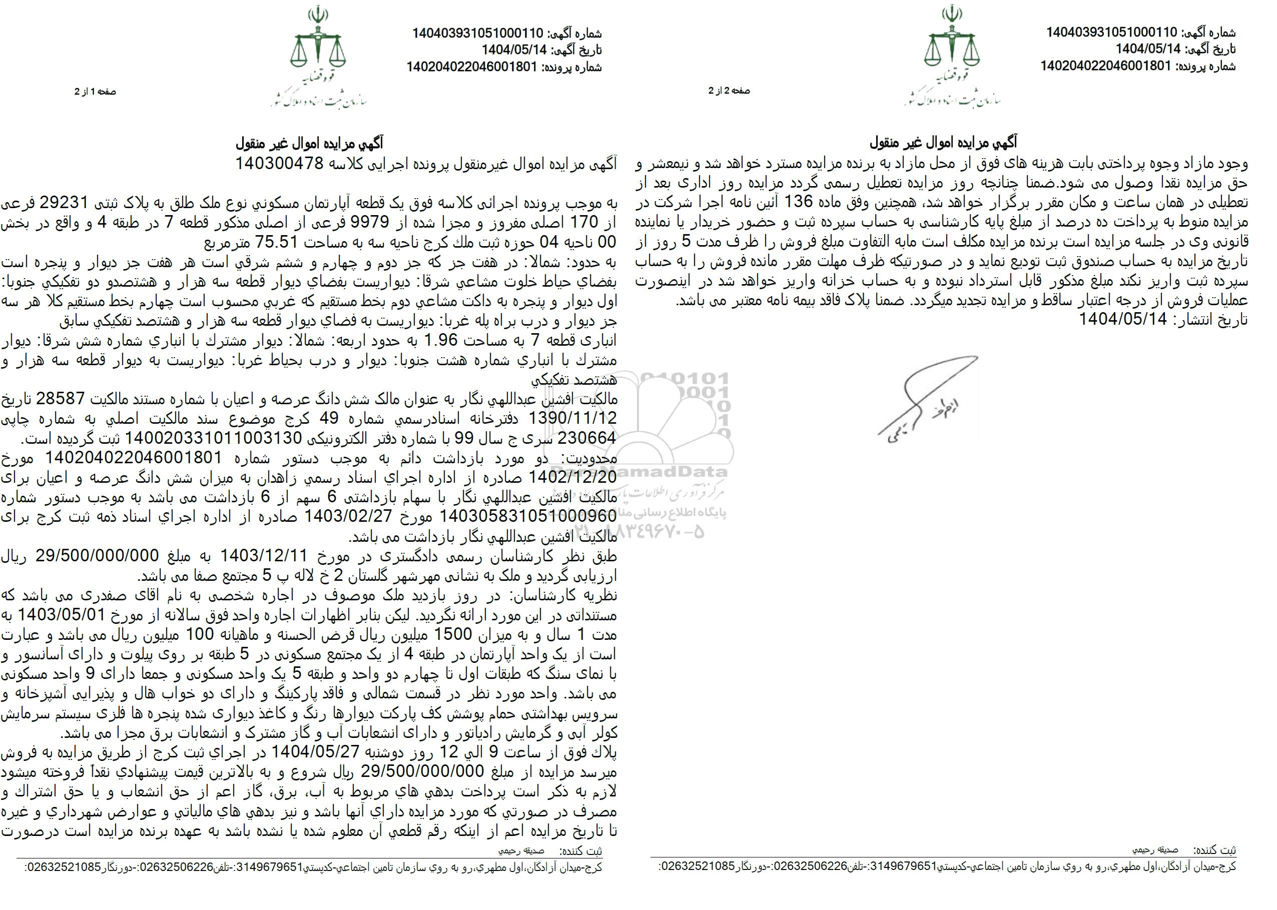 مزایده فروش یک قطعه آپارتمان مسکونی با پلاک ثبتی 29231 فرعی از 170 اصلی