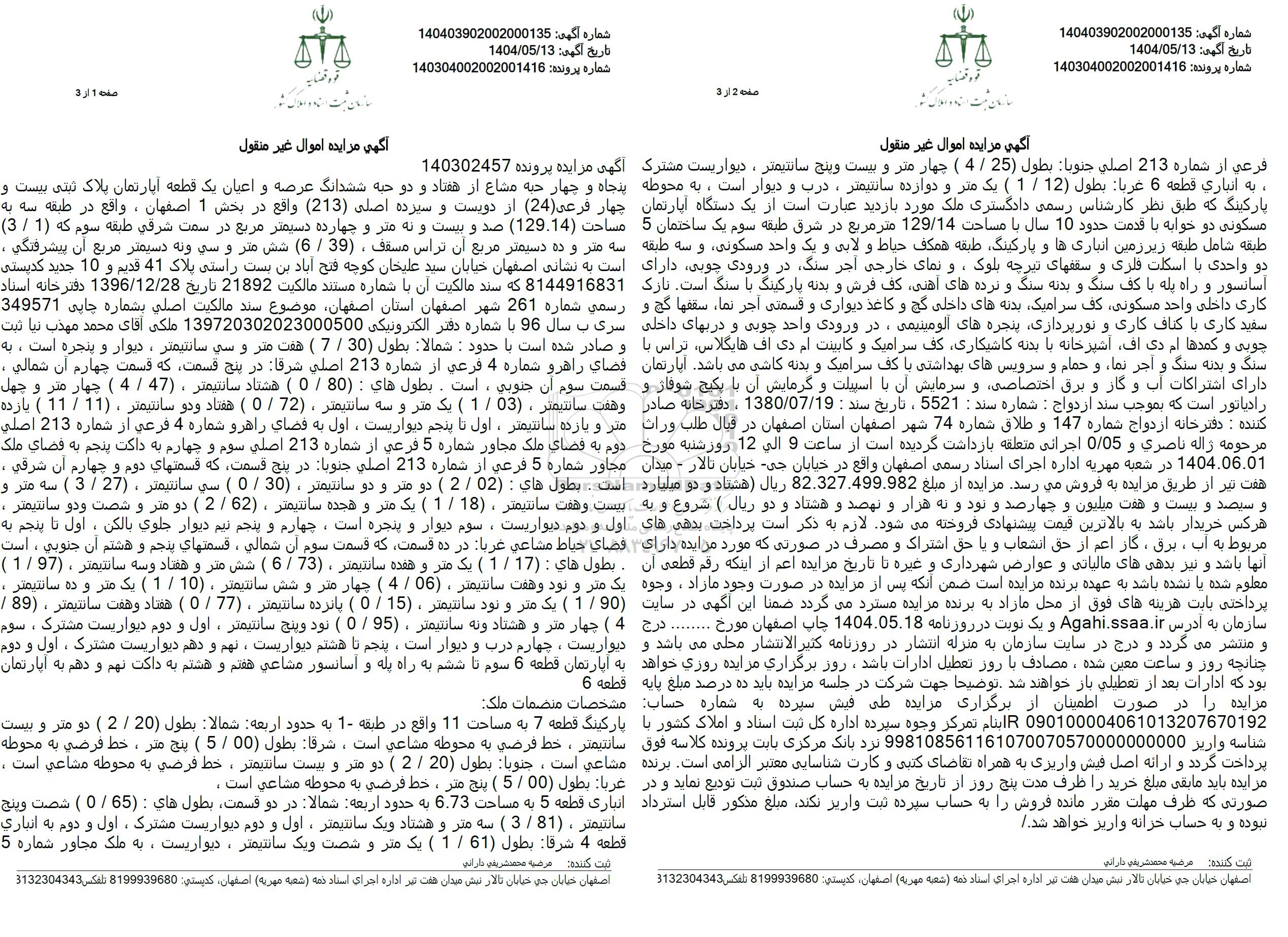 مزایده عمومی مزایده پنجاه و چهار حبه مشاع از هفتاد و دو جبه ششدانگ عرصه و اعیان یک قطعه آپارتمان برگزار میگردد. از کلیه افراد متخصص و شرکتهای واجد شرایط دعوت به عمل میآید تا در این مزایده با کد خبرگزاری پارس نماد : 9372803 شرکت نمایند تاریخ شروع مزایده : 1404/05/14 مهلت شرکت در مزایده: تا پایان روز 1404/06/01 مکان برگزاری اموال واگذاری استانهای اصفهان و دستهبندیهای مربوط به این حراجی املاک و زمین میباشد.