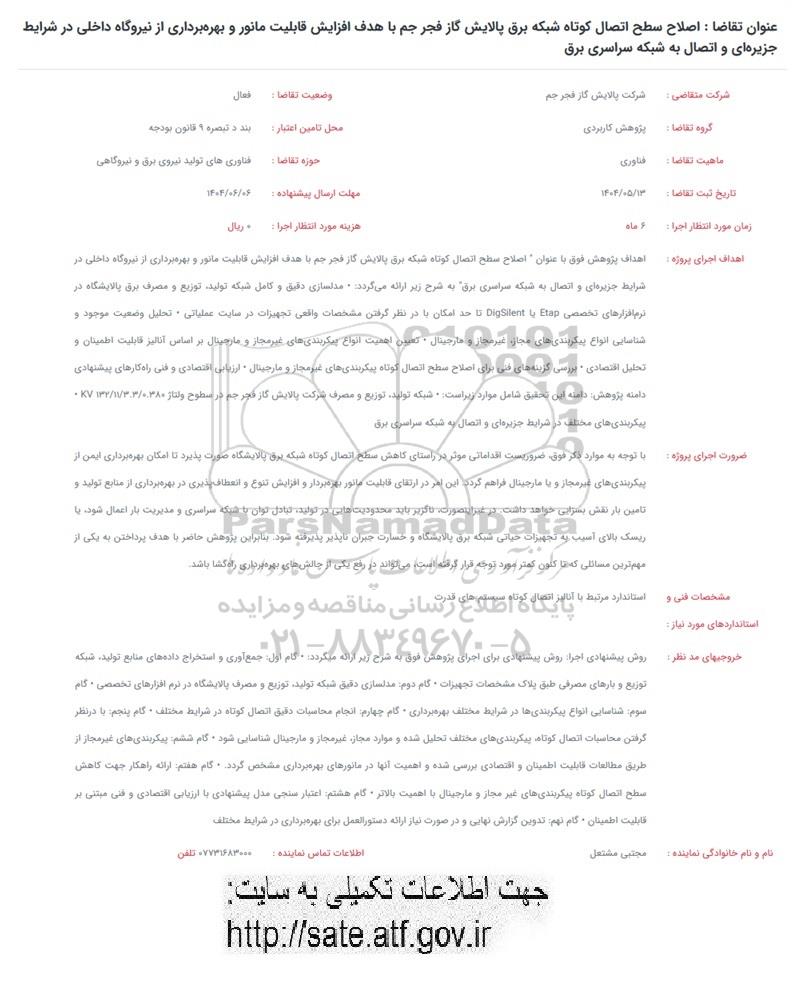 عنوان تقاضا: اصلاح سطح اتصال کوتاه شبکه برق پالایش گاز فجر جم با هدف افزایش قابلیت مانور و بهره برداری از نیروگاه داخلی در شرایط جزیره ای و اتصال به شبکه سراسری برق