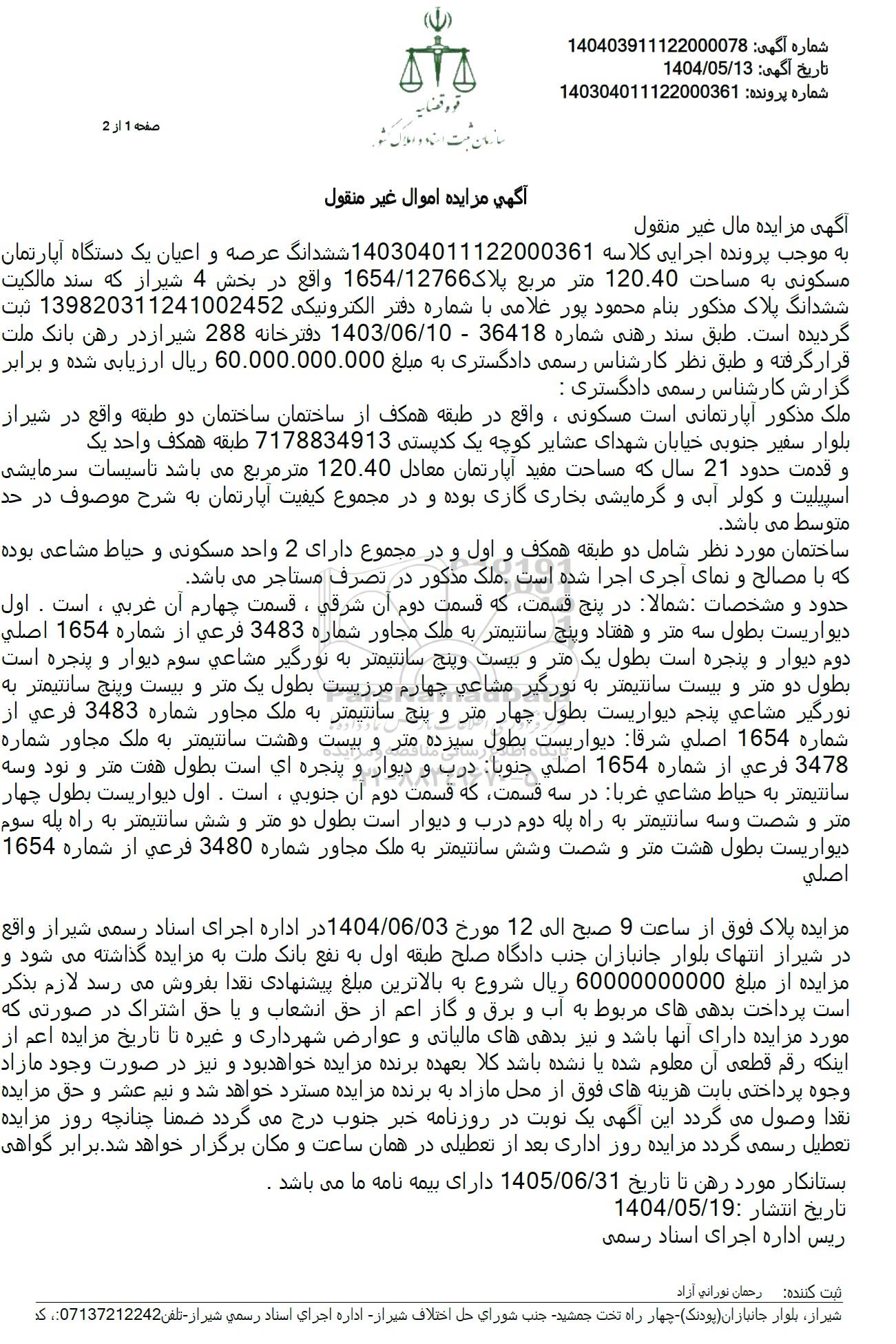 مزایده آپارتمان مسکونی 120.40 مترمربع