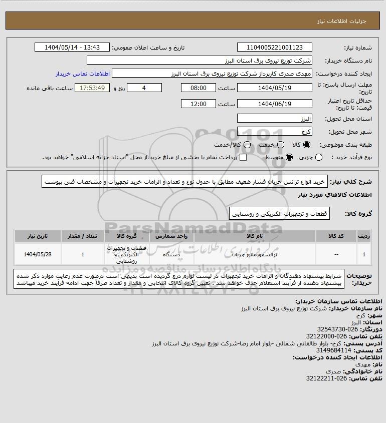 | 1 | -- | ترانسفورماتور جریان | دستگاه | قطعات و تجهیزات الکتریکی و روشنایی | 1 | 1404/05/28 |