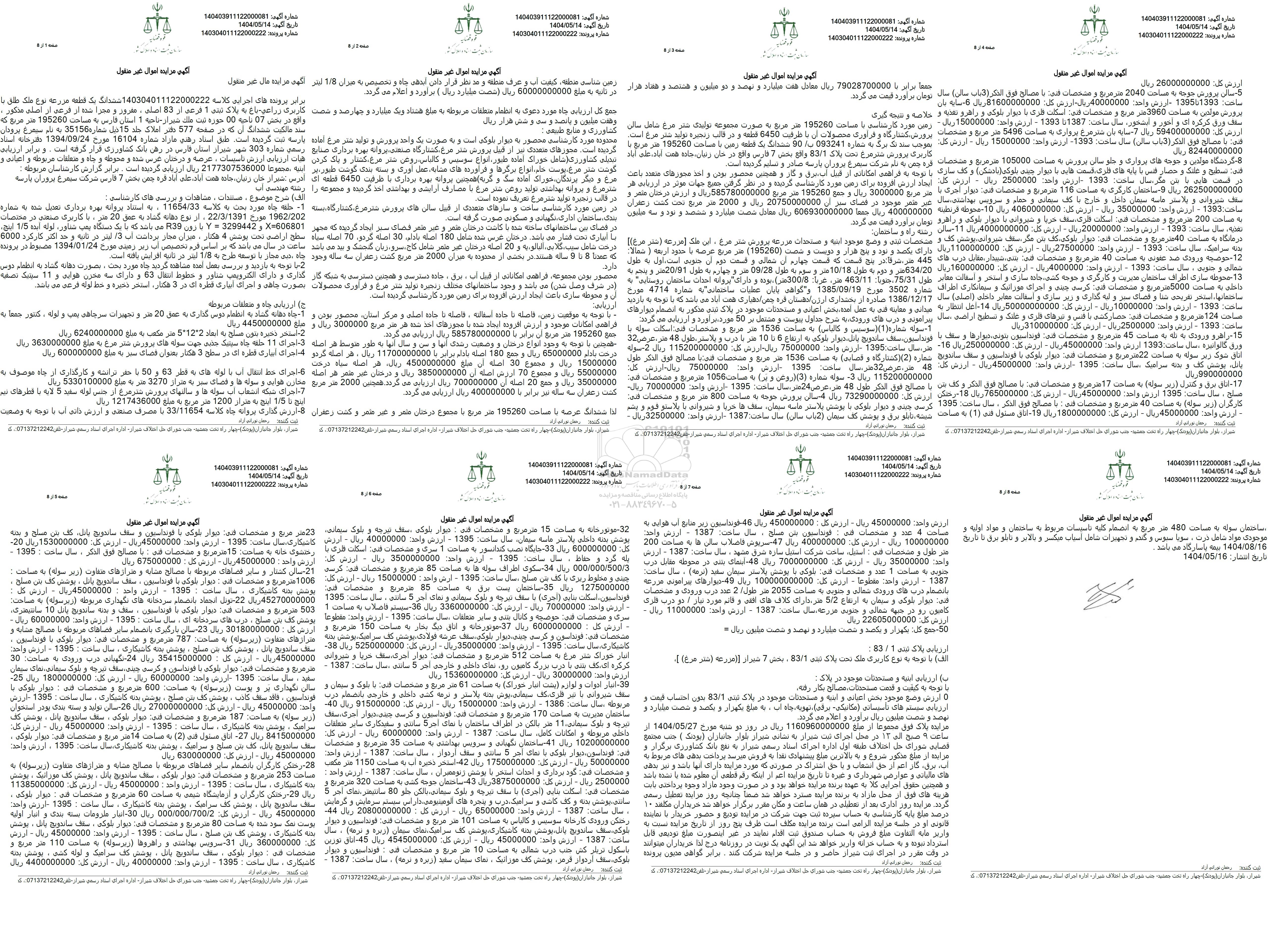 مزایده فروش ملک با کاربری زراعی-باغ با مساحت 195260 مترمربع با پلاک ثبتی 1 فرعی از 83 اصلی و درختان غرس شده, محوطه, چاه و متعلقات مربوط به اعیانی و ابنیه