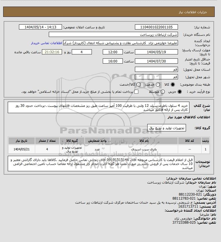 | 1 | -- | باتری سرب اسیدی | عدد | تجهیزات تولید و توزیع برق | 4 | 1404/05/21 |