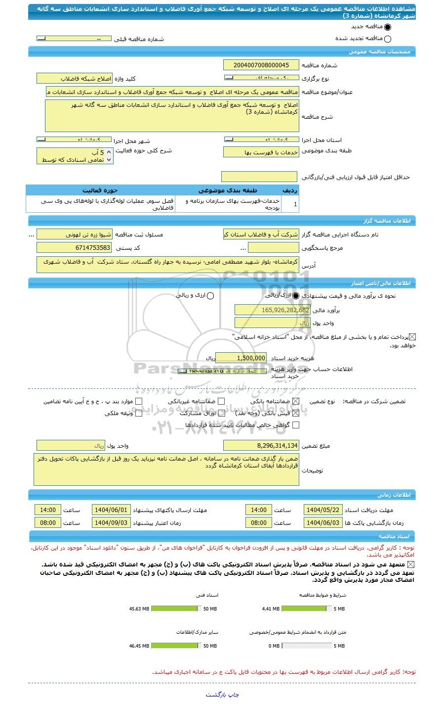 | شرح مناقصه | اصلاح و توسعه شبکه جمع آوری فاضلاب و استاندارد سازی انشعابات مناطق سه گانه شهر کرمانشاه (شماره 3) | ||||||||