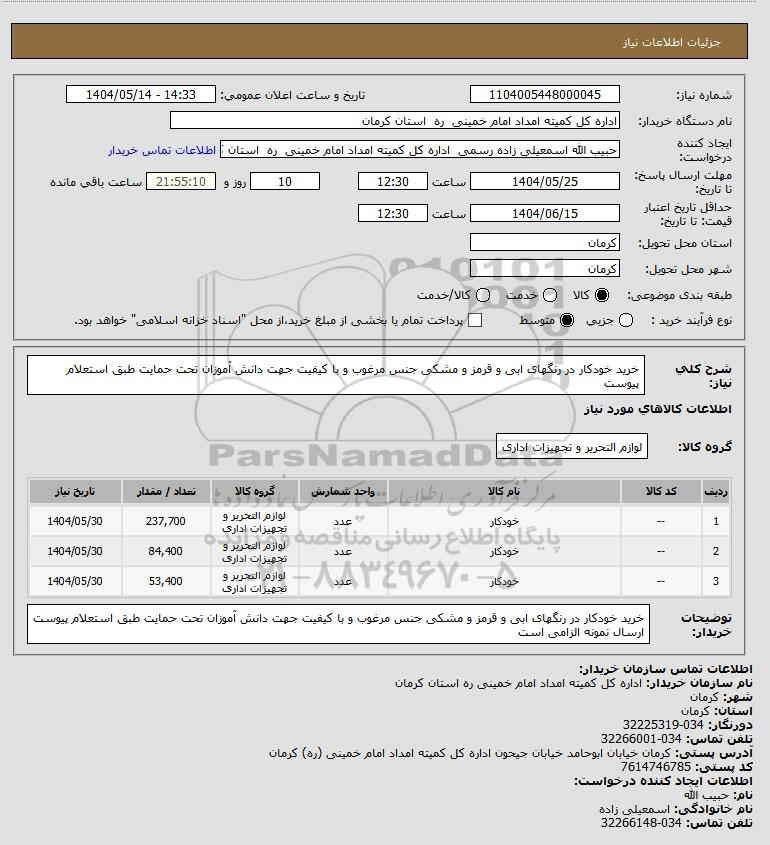 شرح کلی نیاز: خرید خودکار در رنگهای ابی و قرمز و مشکی جنس مرغوب و با کیفیت جهت دانش آموزان تحت حمایت طبق استعلام پیوست