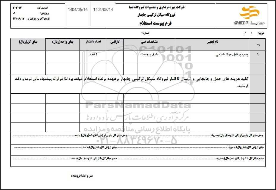 استعلام بها و موضوع استعلام استعلام پمپ پرتابل مواد شیمی به اطلاع کلیه شرکتها و افراد متخصص واجد شرایط میرساند، آگهی گذار در نظر دارد از طریق استعلام بها، نسبت به انتخاب و دریافت پیشنهادات اقدام نماید. این استعلام با کد آگهی ثبت شده در سامانه خبرگزاری پارس نماد : 9373118 منتشر شده است. مشخصات استعلام : تاریخ شروع استعلام: 1404/05/14 آخرین مهلت ارسال پیشنهاد قیمت : 1404/05/16 و محل اجرای پروژه : استان سیستان و بلوچستان میباشد. استعلام قیمت مورد درخواست : استعلام پمپ پرتابل مواد شیمی با دستهبندیهای تخصصی و گروه های مرتبط : الکتروموتور و پمپ های شناور, نیروگاه, تجهیزات برق و الکترونیک, استعلام اطلاع رسانی میگردد. شرایط شرکت در استعلام آنلاین : ابتدا ثبت نام در سامانه استعلام پارس نماد و تکمیل مدارک موردنیاز و بارگذاری در سامانه رعایت تمامی ضوابط و الزامات مندرج در اسناد استعلام است.