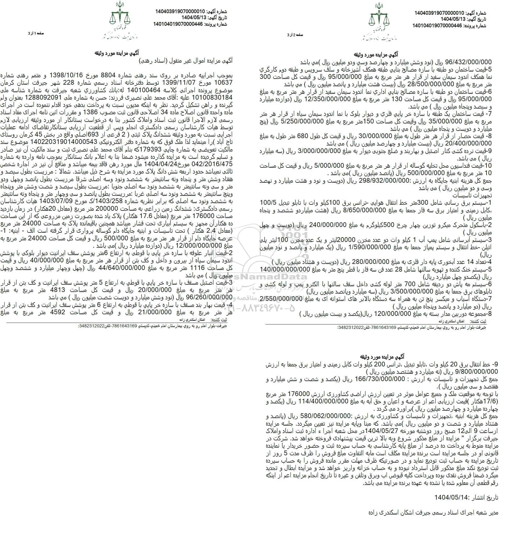 مزایده از ساعت 9 الی 12 در تاریخ 1404.5.27 در اداره ثبت اسناد و املاک جیرفت برگزار میشود