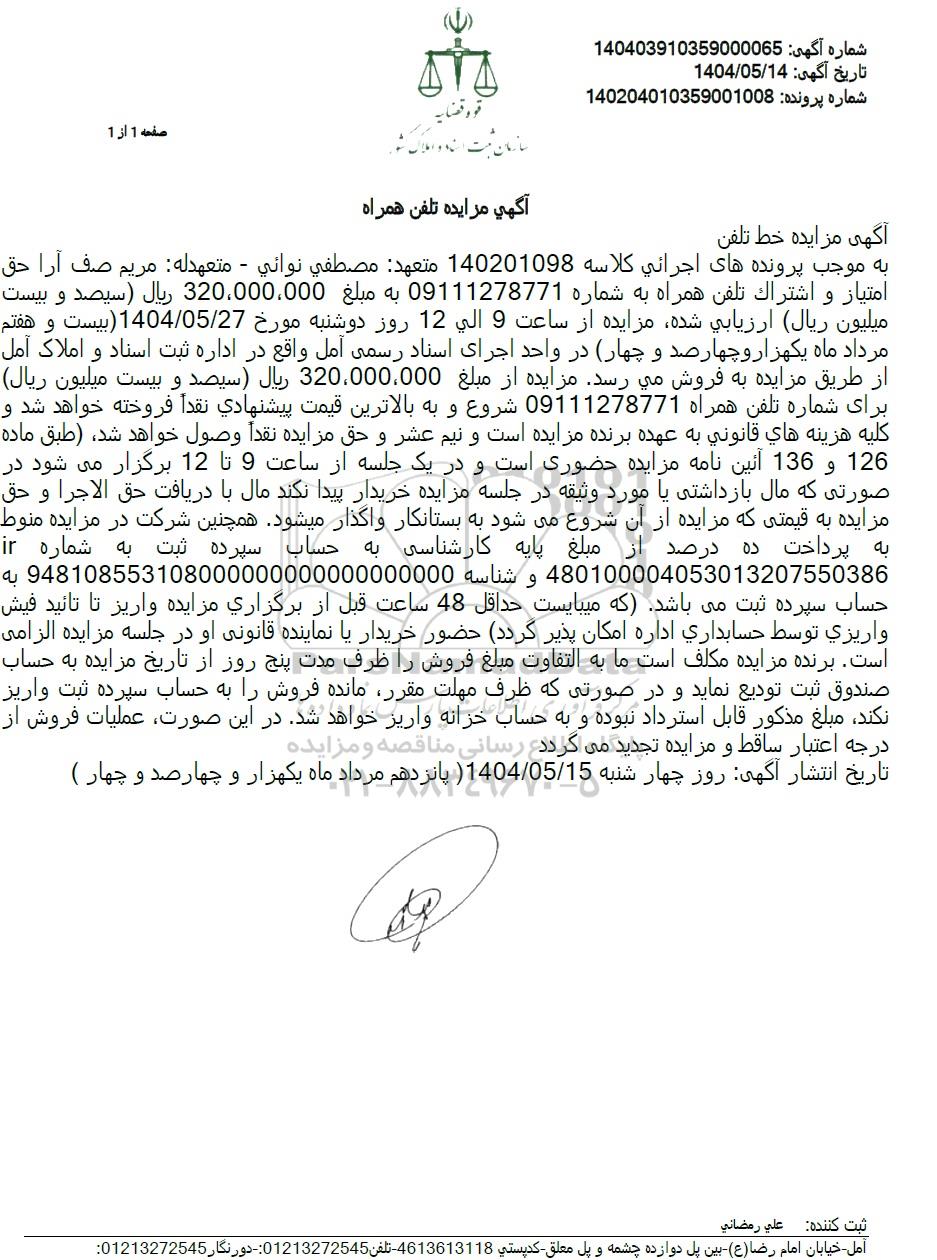 زمان مزایده ساعت 9 تا 12 روز دوشنبه مورخ 1404.05.27