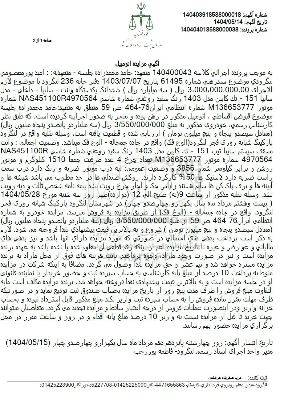 مزایده ششدانگ یک دستگاه وانت سایپا