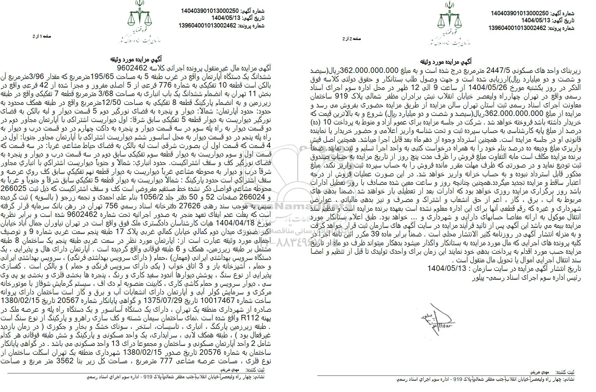 مزایده ششدانگ یک دستگاه آپارتمان مساحت 195.65 مترمربع