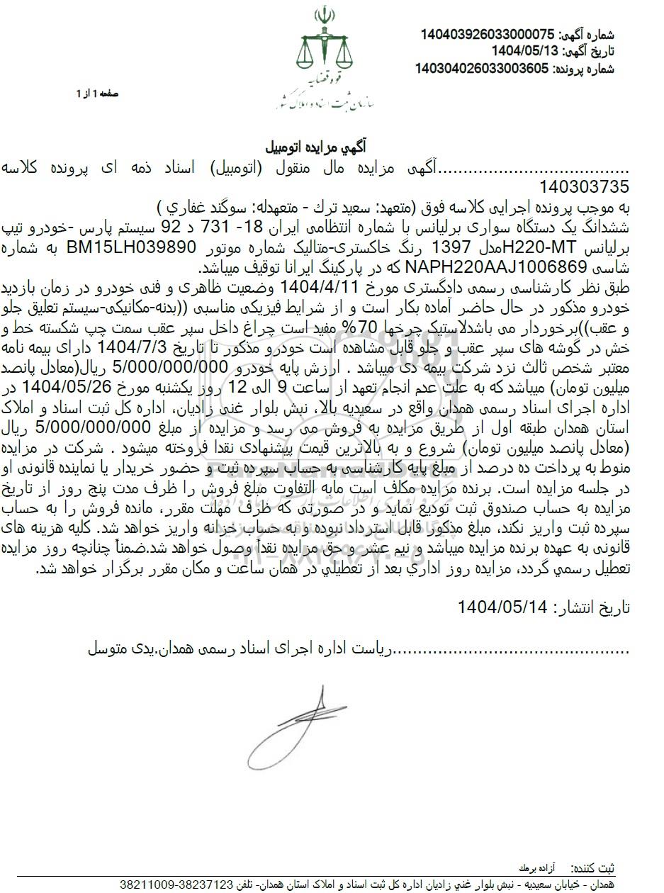 مزایده فروش یک دستگاه خودرو برلیانس مدل 1397 رنگ خاکستری متالیک