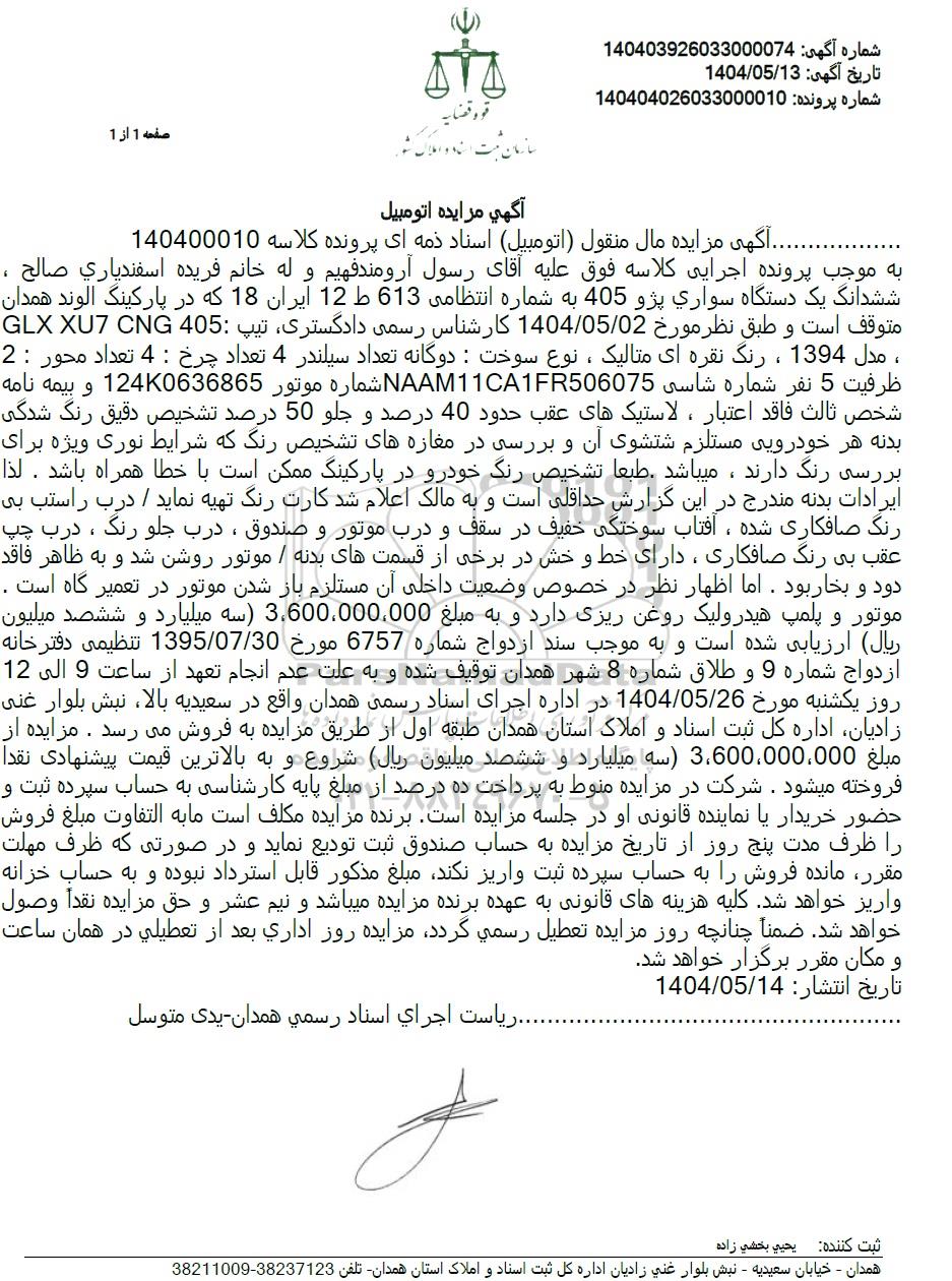 مزایده فروش یک دستگاه خودرو پژو 405 نقره ای متالیک مدل 1394