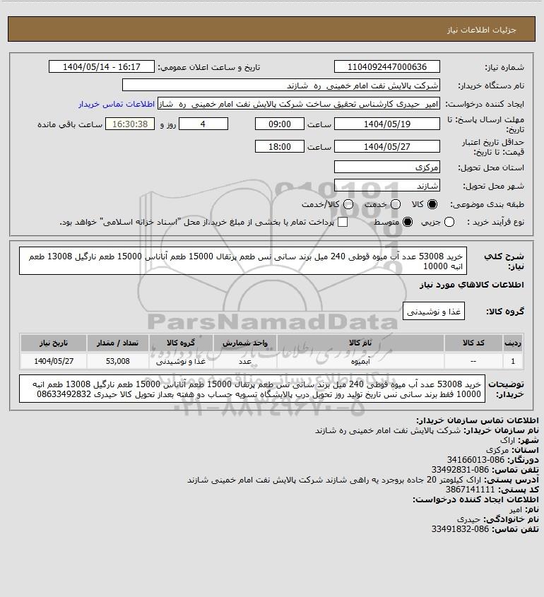 شرح کلی نیاز: خرید 53008 عدد آب میوه قوطی 240 میل برند سانی نس
