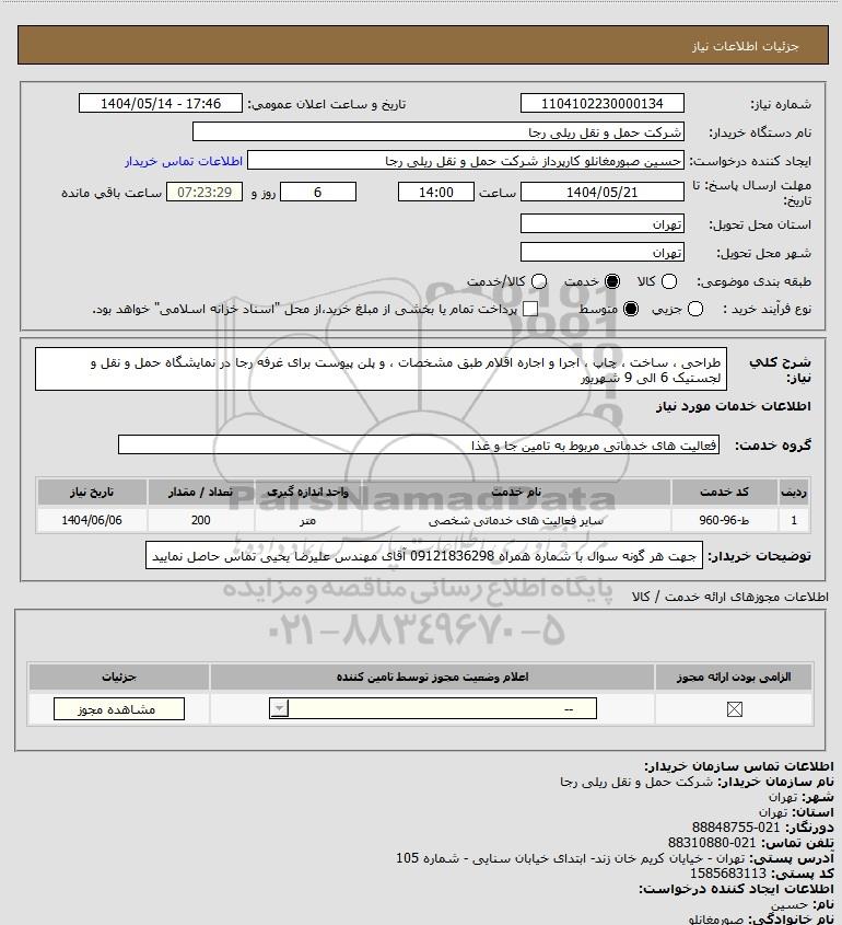 شرح کلی نیاز: طراحی ، ساخت ، چاپ ، اجرا و اجاره اقلام طبق مشخصات ، و پلن پیوست برای غرفه رجا در نمایشگاه حمل و نقل و لجستیک 6 الی 9 شهریور