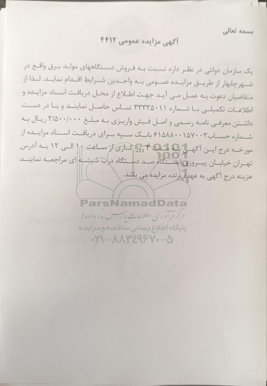 یک سازمان دولتی در نظر دارد نسبت به فروش دستگاههای مولد برق واقع در شهر چابهار از طریق مزایده عمومی به واجدین شرایط اقدام نماید. لذا از متقاضیان واجد شرایط دعوت به عمل می آید جهت اطلاع از محل دریافت اسناد مزایده و اطلاعات تکمیلی با شماره 33335011 تماس حاصل نمایند و با در دست داشتن معرفی نامه رسمی و اصل فیش واریزی به مبلغ 3.500.000 ریال به شماره حساب 6158800157003 بانک سپه، برای دریافت اسناد مزایده از تاریخ درج این آگهی به مدت 3 روز کاری از ساعت 10 الی 12 به آدرس: تهران - خیابان پیروزی - ایستگاه صد دستگاه درب شیشه ای مراجعه نمایند.