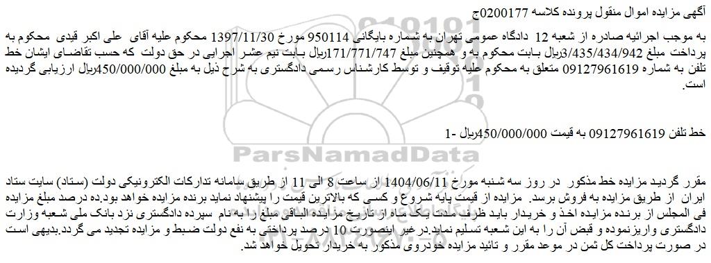 آگهی مزایده اموال منقول پرونده کلاسه 0200177ج