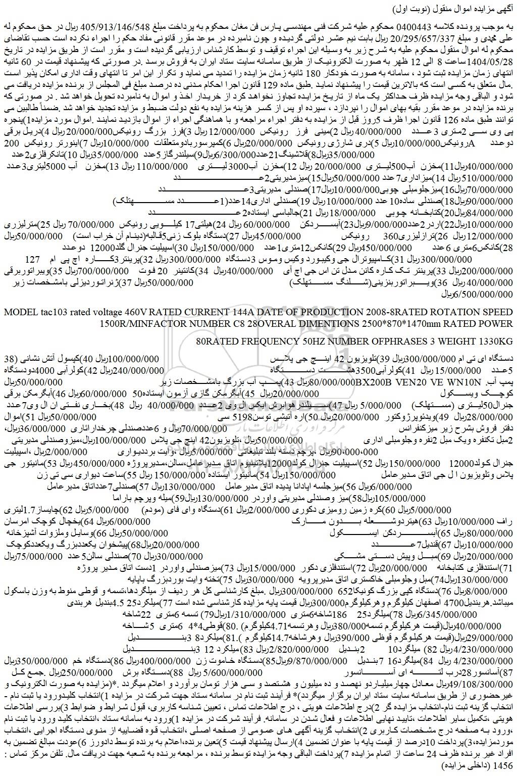 به موجب پرونده کلاسه 0400443 محکوم علیه شرکت فنی مهندسی پارس فن مغان محکوم به پرداخت مبلغ 405/913/146/548 ریال در حق محکوم له علی محمدی و مبلغ 20/295/657/337 ریال بابت نیم عشر دولتی گردیده و چون نامبرده در موعد مقرر قانونی مفاد حکم را اجراء نکرده است حسب تقاضای محکوم له اموال منقول محکوم علیه به شرح زیر به وسیله این اجراء توقیف و توسط کارشناس ارزیابی گردیده است و مقرر است از طریق مزایده در تاریخ 1404/05/28ساعت 8 الی 12 ظهر به صورت الکترونیک از طریق سامانه سایت ستاد ایران به فروش برسد .در صورتی که پیشنهاد قیمت در 60 ثانیه انتهای زمان مزایده ثبت شود ، سامانه به صورت خودکار 180 ثانیه زمان مزایده را تمدید می نماید و تکرار این امر تا انتهای وقت اداری امکان پذیر است .مال متعلق به کسی است که بالاترین قیمت را پیشنهاد نماید .طبق ماده 129 قانون اجرا احکام مدنی ده درصد مبلغ فی المجلس از برنده مزایده دریافت می شود و الباقی وجه مزایده ظرف حداکثر یک ماه از تاریخ مزایده تجاوز نخواهد کرد از خریدار اخذ و اموال به نامبرده تحویل خواهد شد . در صورتی که برنده مزایده در موعد مقرر بقیه بهای اموال را نپردازد ، سپرده او پس از کسر هزینه مزایده به نفع دولت ضبط و مزایده تجدید خواهد شد .ضمناً طالبین می توانند طبق ماده 126 قانون اجرا ظرف 5روز قبل از مزایده به دفتر اجراء مراجعه و با هماهنگی اجراء از اموال بازدید نمایند .اموال مورد مزایده1)پنجره پی وی سی 2متری 3عدد 40/000/000ریال 2)مینی فرز رونیکس 12/000/000ریال 3)فرز بزرگ رونیکس20/000/000ریال 4)دریل برقی رونیکس10/000/000ریال 5)دری شارژی رونیکس 20/000/000ریال 6)کمپرسوربادومتعلقات 10/000/000ریال 7)اینورتر رونیکس 200a دوعدد 35/000/000ریال8)قلاشینگ21عدد6/300/000ریال9)سیلندرگاز5عدد 35/000/000ریال 10)تانکرفلزی2عدد 40/000/000ریال11)مخزن آب500لیتری 20/000/000ریال 12)مخزن آب3000لیتری 110/000/000ریال 13)مخزن آب 5000لیتری3عدد 510/000/000ریال 14)میزاداری7عدد 50/000/000ریال15)میزمدیریتی2عدد 70/000/000ریال16)میزجلومبلی چوبی10/000/000ریال17)صندلی مدیریتی3عدد 90/000/000ریال18)صندلی ساده10عدد 10/000/000ریال 19)صندلی اداری14عدد(1عدد مسهتلک) 84/000/000ریال20)کتابخانه چوبی 18/000/000ریال 21)جالباسی ایستاده2عدد 10/000/000ریال22)اردر2عدد9/000/000ریال23)آبسردکن 60/000/000ریال 24)هیلتی17 کیلویی رونیکس 70/000/000ریال 25)مترلیزری 12/000/000ریال 26)ترازلیزری360 رونیکس 45/000/000ریال 27)دستگاه بلوک زنی5قالبه(دینام آن خراب است) 50/000/000ریال 28)کانکس6متری 6عدد 450/000/000ریال 29)کانکس12متری1عدد 150/000/000ریال 30)اسپیلیت جنرال گلد12000 دوعدد 300/000/000ریال 31)کامپیوترال جی وکیبورد وکیس وموس 3دستگاه 300/000/000ریال 32)پرینتر3کاره اچ پی ام 127 200/000/000ریال 33)پرینتر تک کاره کانن مدل تن اس جی اچ آی 40/000/000ریال 34)کانتینر 20 فوت 700/000/000ریال 35)ویبراتوربرقی 40/000/000ریال 36)ویبراتوربنزینی(شلنگ مستهلک) 50/000/000ریال 37)ژنراتوردیزلی بامشخصات زیر 6/500/000/000ریال