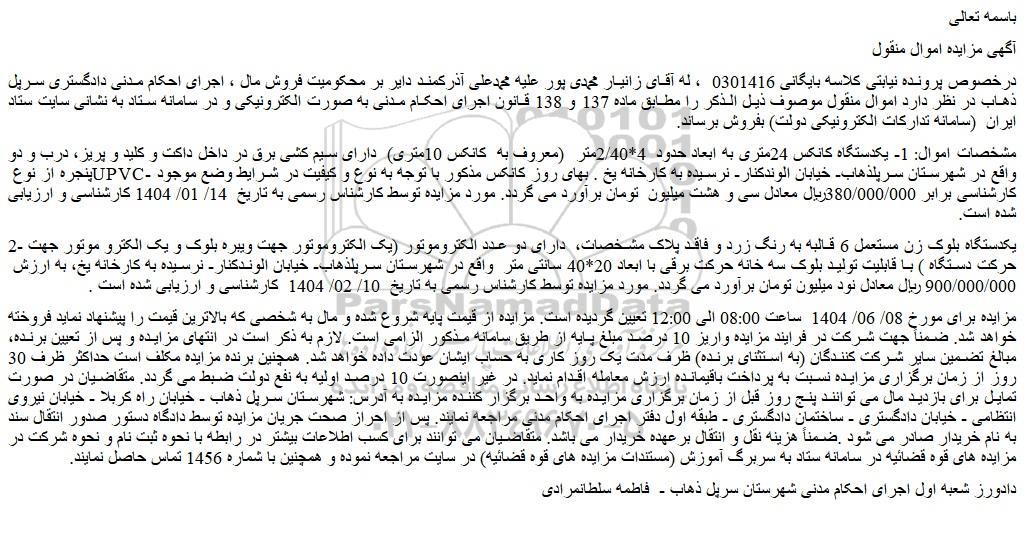 مزایده برای مورخ 08/ 06/ 1404 ساعت 08:00 الی 12:00 تعیین گردیده است. مزایده از قیمت پایه شروع شده و مال به شخصی که بالاترین قیمت را پیشنهاد نماید فروخته خواهد شد. ضمناً جهت شرکت در فرایند مزایده واریز 10 درصد مبلغ پایه از طریق سامانه مذکور الزامی است. لازم به ذکر است در انتهای مزایده و پس از تعیین برنده، مبالغ تضمین سایر شرکت کنندگان (به استثنای برنده) ظرف مدت یک روز کاری به حساب ایشان عودت داده خواهد شد. همچنین برنده مزایده مکلف است حداکثر ظرف 30 روز از زمان برگزاری مزایده نسبت به پرداخت باقیمانده ارزش معامله اقدام نماید. در غیر اینصورت 10 درصد اولیه به نفع دولت ضبط می گردد. متقاضیان در صورت تمایل برای بازدید مال می توانند پنج روز قبل از زمان برگزاری مزایده به واحد برگزار کننده مزایده به آدرس: شهرستان سرپل ذهاب - خیابان راه کربلا - خیابان نیروی انتظامی - خیابان دادگستری - ساختمان دادگستری - طبقه اول دفتر اجرای احکام مدنی مراجعه نمایند. پس از احراز صحت جریان مزایده توسط دادگاه دستور صدور انتقال سند به نام خریدار صادر می شود .ضمناً هزینه نقل و انتقال برعهده خریدار می باشد. متقاضیان می توانند برای کسب اطلاعات بیشتر در رابطه با نحوه ثبت نام و نحوه شرکت در مزایده های قوه قضائیه در سامانه ستاد به سربرگ آموزش (مستندات مزایده های قوه قضائیه) در سایت مراجعه نموده و همچنین با شماره 1456 تماس حاصل نمایند.