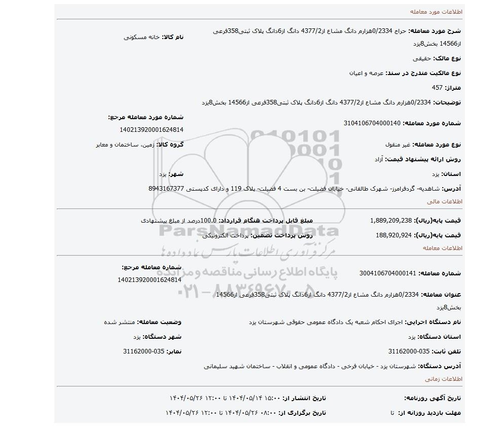 | عنوان معامله: 0/2334هزارم دانگ مشاع از4377/2 دانگ از6دانگ پلاک ثبتی358فرعی از14566 بخش8یزد | ||