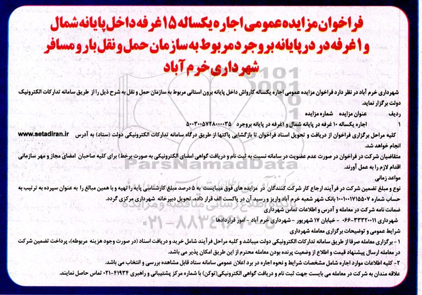 فراخوان مزایده عمومی اجاره یکساله 15 غرفه داخل پایانه شمال و 1 غرفه در در پایانه بروجرد مربوط به سازمان حمل و نقل بار و مسافر شهرداری خرم آباد