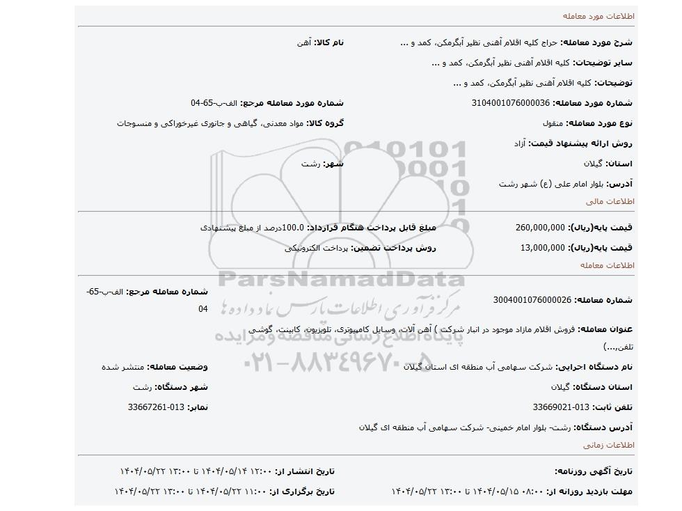 مزایده عمومی مزایده کلیه اقلام آهنی نظیر آبگرمکن کمد و برگزار میگردد. از کلیه افراد متخصص و شرکت‌های واجد شرایط دعوت به عمل می‌آید تا در این مزایده با کد خبرگزاری پارس نماد : 9375070 شرکت نمایند تاریخ شروع مزایده : 1404/05/14 مهلت شرکت در مزایده: تا پایان روز 1404/05/22 مکان برگزاری اموال واگذاری استان‌های گیلان و دسته‌بندی‌های مربوط به این حراجی آهن آلات, متفرقه میباشد.