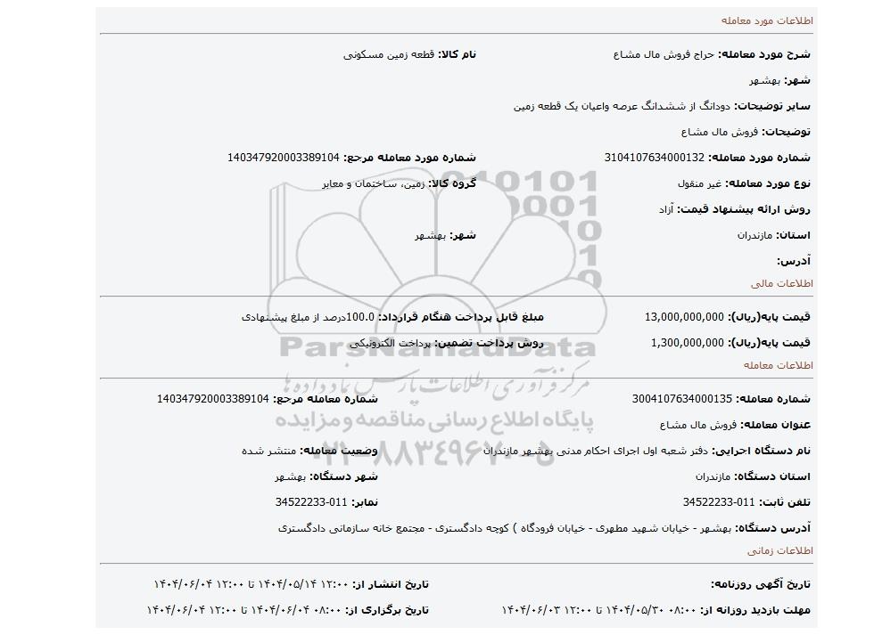 شرح مورد معامله: حراج فروش مال مشاعنام کالا: قطعه زمین مسکونی