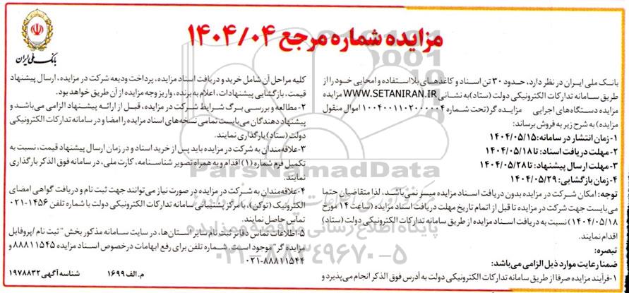 بانک ملی ایران در نظر دارد، حدود 30 تن اسناد و کاغذهای بلااستفاده و امحایی خود را از طریق سامانه تدارکات الکترونیکی دولت (ستاد) به نشانی ستاد ایران مزایده دستگاه های اجرایی مزایده گر (تحت شماره 1004001102000004 اموال منقول مزایده) به شرح زیر به فروش برساند: