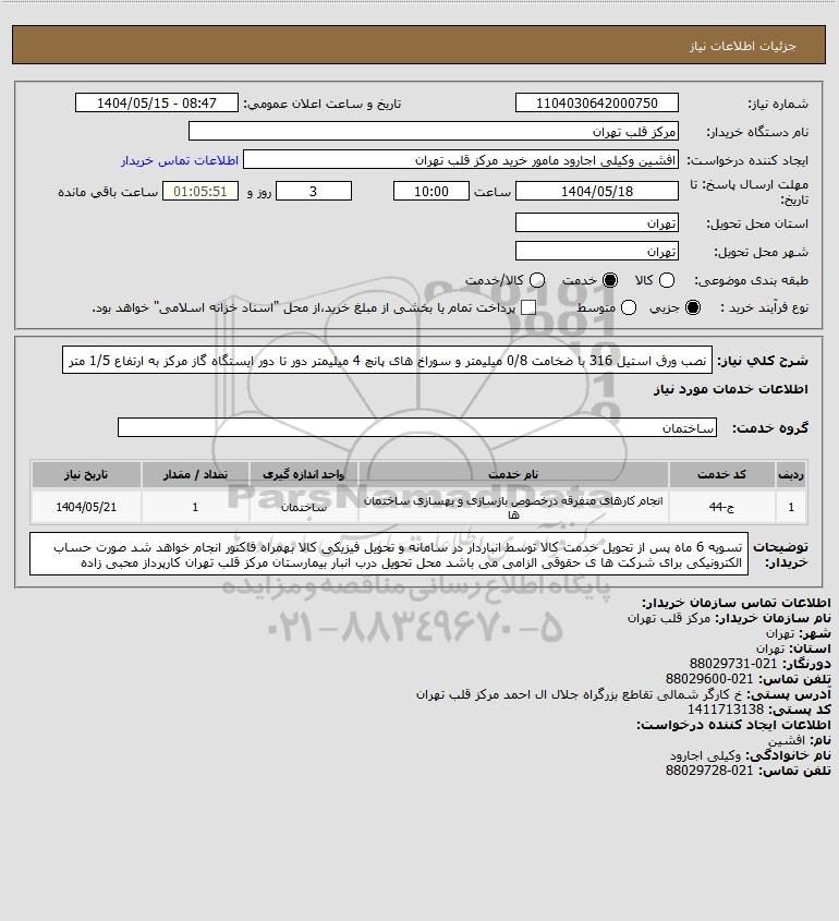 استعلام بها و موضوع استعلام استعلام نصب ورق استیل 316 با ضخامت 0/8 میلیمتر و سوراخ های پانچ 4 میلیمتر دور تا دور ایستگاه گاز مرکز به ارتفاع 1/5 متر به اطلاع کلیه شرکتها و افراد متخصص واجد شرایط میرساند، آگهی گذار در نظر دارد از طریق استعلام بها، نسبت به انتخاب و دریافت پیشنهادات اقدام نماید. این استعلام با کد آگهی ثبت شده در سامانه خبرگزاری پارس نماد : 9375188 منتشر شده است. مشخصات استعلام : تاریخ شروع استعلام: 1404/05/15 آخرین مهلت ارسال پیشنهاد قیمت : 1404/05/18 و محل اجرای پروژه : استان تهران میباشد. استعلام قیمت مورد درخواست : استعلام نصب ورق استیل 316 با ضخامت 0/8 میلیمتر و سوراخ های پانچ 4 میلیمتر دور تا دور ایستگاه گاز مرکز به ارتفاع 1/5 متر با دستهبندیهای تخصصی و گروه های مرتبط : صنایع ورقکاری, قطعات استنلس استیل, ساختمان, استعلام اطلاع رسانی میگردد. شرایط شرکت در استعلام آنلاین : ابتدا ثبت نام در سامانه استعلام پارس نماد و تکمیل مدارک موردنیاز و بارگذاری در سامانه رعایت تمامی ضوابط و الزامات مندرج در اسناد استعلام است.