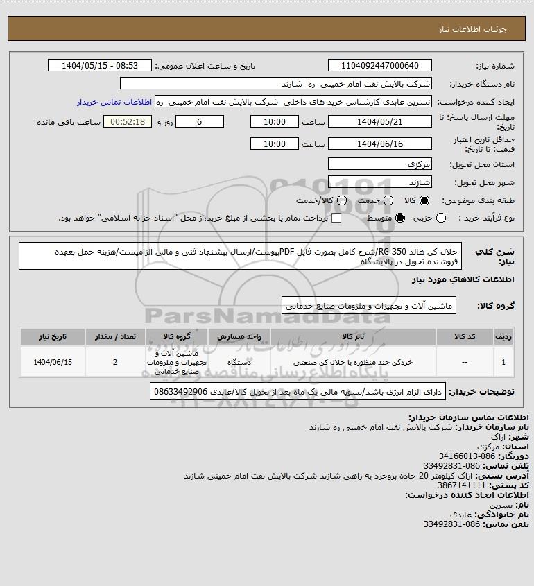 شرح کلی نیاز: خلال کن هالد RG-350/شرح کامل بصورت فایل PDFپیوست/ارسال پیشنهاد فنی و مالی الزامیست/هزینه حمل بعهده فروشنده