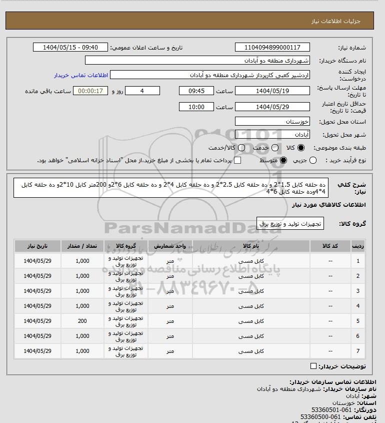 شرح کلی نیاز: ده حلقه کابل 1.5*2 و ده حلقه کابل 2.5*2 و ده حلقه کابل 4*2 و ده حلقه کابل 6*2و 200متر کابل 10*2و ده حلقه کابل 4*4وده حلقه کابل 6*4
