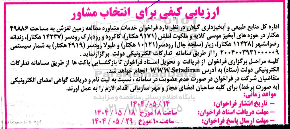 اداره کل منابع طبیعی و آبخیزداری گیلان در نظر دارد فراخوان خدمات مشاوره مطالعه زمین لغزش به مساحت 49886 هکتار در حوزه های آبخیز موسی کلایه و ملکوت املش 9171) (هکتار) کاکرود و رودبارک رودسر (14237 هکتار)، زندانه رضوانشهر (11438 هکتار زیار (سلجه (چال) رودسر (10121) (هکتار) و طیولا رودسر 4919) هکتار به شمار سیستمی 2004003931000009 را از طریق سامانه تدارکات الکترونیکی دولت برگزار نماید .