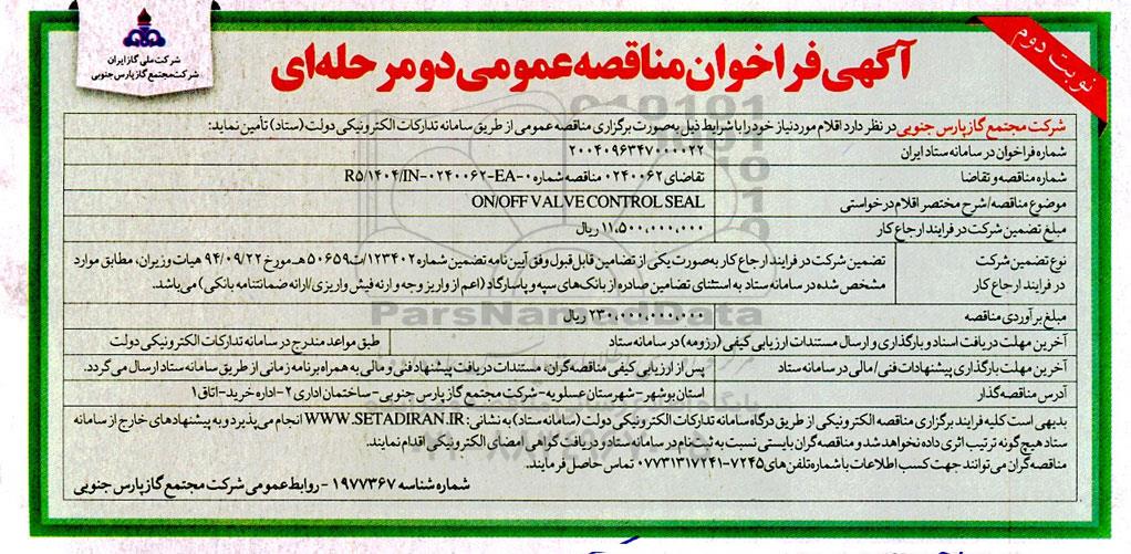 مناقصه ON/OFF VALVE CONTROL SEAL نوبت دوم , مناقصه ON/OFF VALVE CONTROL SEAL نوبت دوم