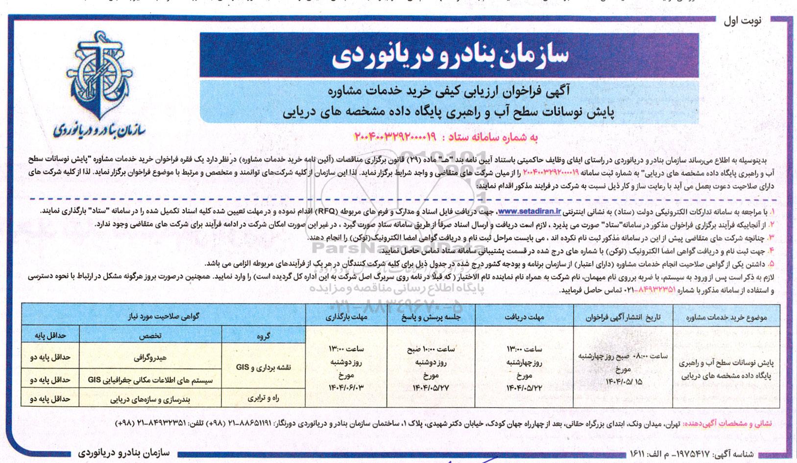 بدینوسیله به اطلاع میرساند سازمان بنادر و دریانوردی در راستای ایفای وظایف حاکمیتی باستناد آیین نامه بند "هـ" ماده (29) قانون برگزاری مناقصات آئین نامه خرید خدمات مشاوره در نظر دارد یک فقره فراخوان خرید خدمات مشاوره پایش نوسانات سطح آب و راهبری پایگاه داده مشخصه های دریایی به شماره ثبت سامانه 2004003292000019 را از میان شرکتهای متقاضی و واجد شرایط برگزار نماید لذا این سازمان از کلیه شرکتهای توانمند و متخصص و مرتبط با موضوع فراخوان برگزار نماید لذا از کلیه شرکت های دارای صلاحیت دعوت بعمل می آید با رعایت ساز و کار ذیل نسبت به شرکت در فرایند مذکور اقدام نمایند