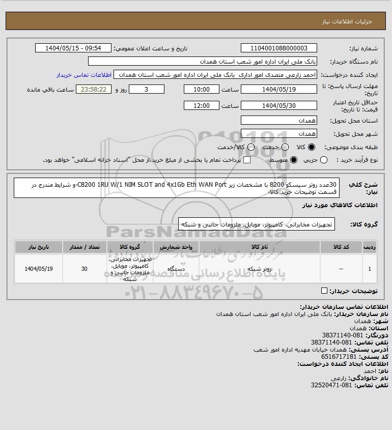 شرح کلی نیاز: 30عدد روتر سیسکو 8200 با مشخصات زیر C8200 1RU W/1 NIM SLOT and 4x1Gb Eth WAN Port-و شرایط مندرج در قسمت توضیحات خرید کالا-