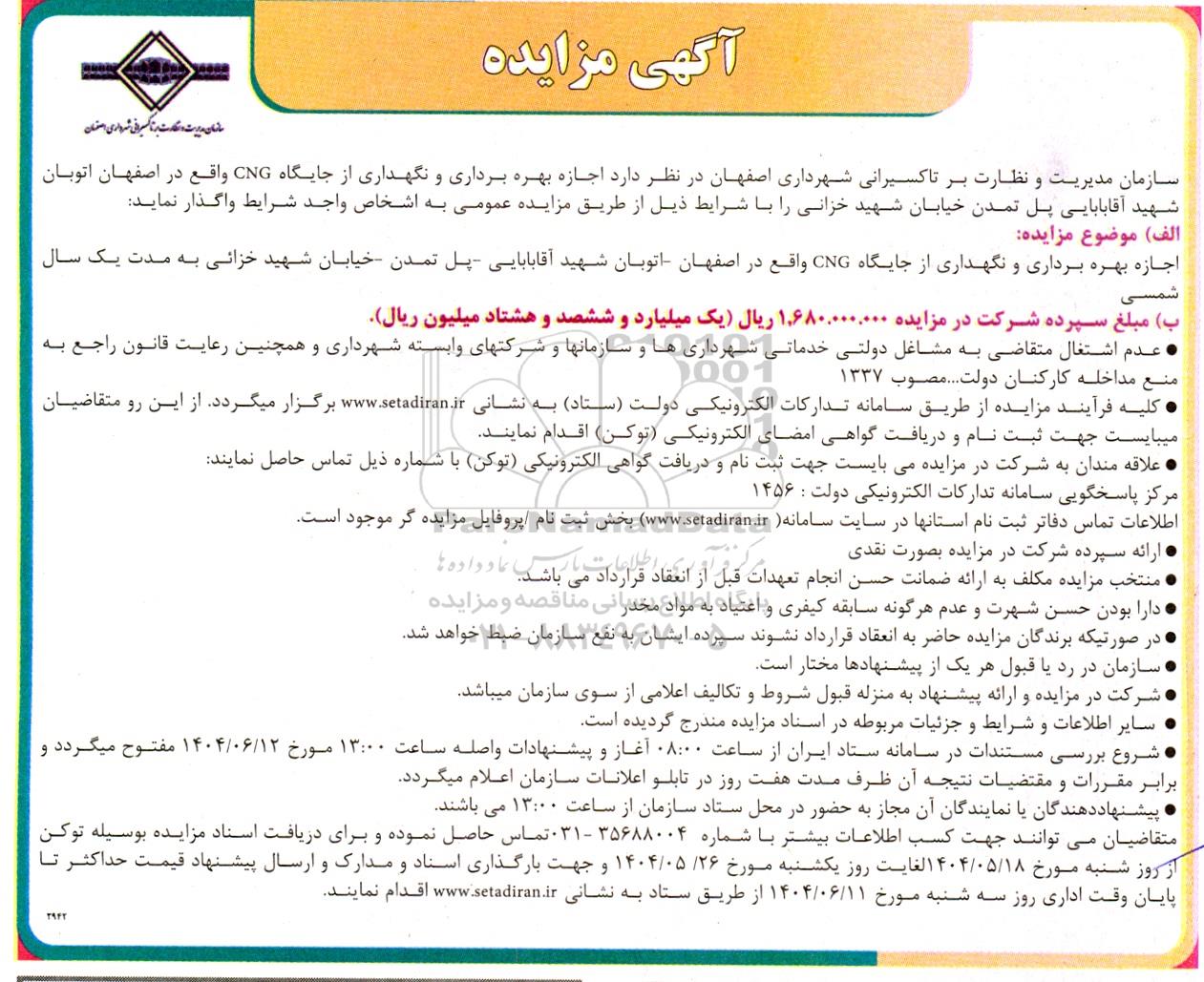 سازمان مدیریت و نظارت بر تاکسیرانی شهرداری اصفهان در نظر دارد اجازه بهره برداری و نگهداری از جایگاه CNG واقع در اصفهان اتوبان شهید آقابابایی پل تمدن خیابان شهید خزانی را با شرایط ذیل از طریق مزایده عمومی به اشخاص واجد شرایط واگذار نماید
