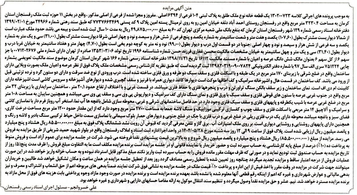 مزایده فروش یک قطعه خانه به پلاک ثبتی 104 فرعی از 6394 اصلی به مساحت 3230.4 مترمربع