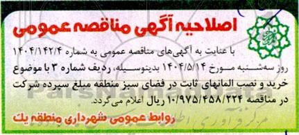 با عنایت به آگهی های مناقصه عمومی به شماره 1404/142/4 روز سه شنبه مورخ 1404.5.14 بدینوسیله ردیف شماره 3 با موضوع خرید و نصب المانهای ثابت در فضای سبز منطقه مبلغ سپرده شرکت در مناقصه 10.975.458.224 ریال اعلام میگردد.