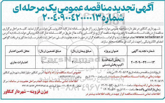 تجدید مناقصه پخش آسفالت با اکیپ پخش دستی از کلیه افراد متخصص و شرکتها واجد شرایط دعوت به عمل میآید در مناقصه با کد خبرگزاری پارس نماد: 9375738 شرکت نمایند.