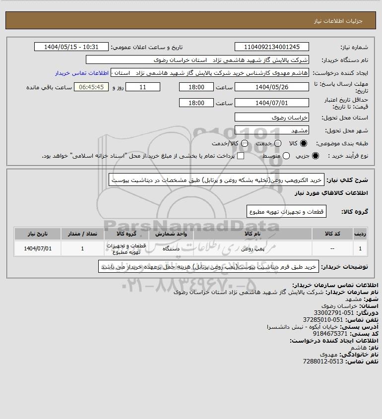 | 1 | -- | پمپ روغن | دستگاه | قطعات و تجهیزات تهویه مطبوع | 1 | 1404/07/01 |