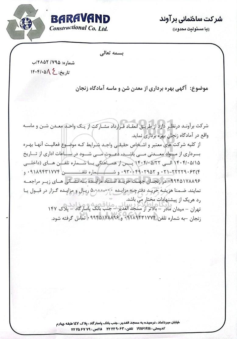 شرکت برآوند در نظر دارد از طریق انعقاد قرارداد مشارکت از یک واحد معدن شن و ماسه واقع در آمادگاه زنجان بهره برداری نماید.
