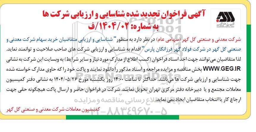 شرکت معدنی و صنعتی گل گهر (سهامی عام) در نظر دارد به منظور شناسایی و ارزیابی متقاضیان خرید سهام شرکت معدنی و صنعتی گل گهر در شرکت فولاد گهر فرزانگان پارس " اقدام به شناسایی و ارزیابی شرکت های صاحب صلاحیت و توانمند نماید. لذا متقاضیان می توانند جهت اخذ اسناد فراخوان (کسب اطلاع از مدارک مورد نیاز و سایر شرایط) به وبسایت این شرکت به نشانی WWW.GEG.IR بخش مناقصه و مزایده مراجعه و اسناد مذکور را دانلود نمایند و پاکت خود را که حاوی مدارک خواسته شده جهت شناسایی و ارزیابی شرکتها میباشد حداکثر تا ساعت 14:00 روز یکشنبه مورخ 1404.5.26  به نشانی دفتر کمیسیون معاملات مجتمع و با دبیرخانه دفتر مرکزی تهران تحویل نمایند. شرکت در فراخوان حاضر و ارسال پاکت هیچگونه حقی جهت ارجاع کار با انتخاب متقاضیان ایجاد نمی نماید.