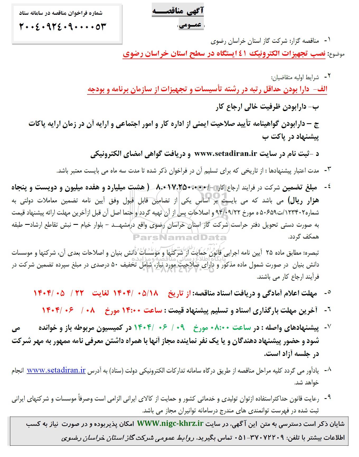 شایان ذکر است دسترسی به متن این آگهی در سایت WWW.nigc-khrz.ir امکان پذیر بوده و در صورت نیاز به کسب اطلاعات بیشتر با تلفن: 37072209-051 تماس بگیرید روابط عمومی شرکت گاز استان خراسان رضوی