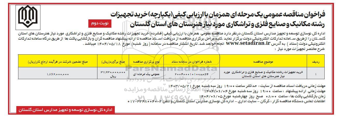 فراخوان مناقصه عمومی یک مرحله ای همزمان با ارزیابی کیفی یکپارچه خرید تجهیزات رشته مکانیک و صنایع فلزی و تراشکاری مورد نیاز هنرستان های استان گلستان - نوبت دوم